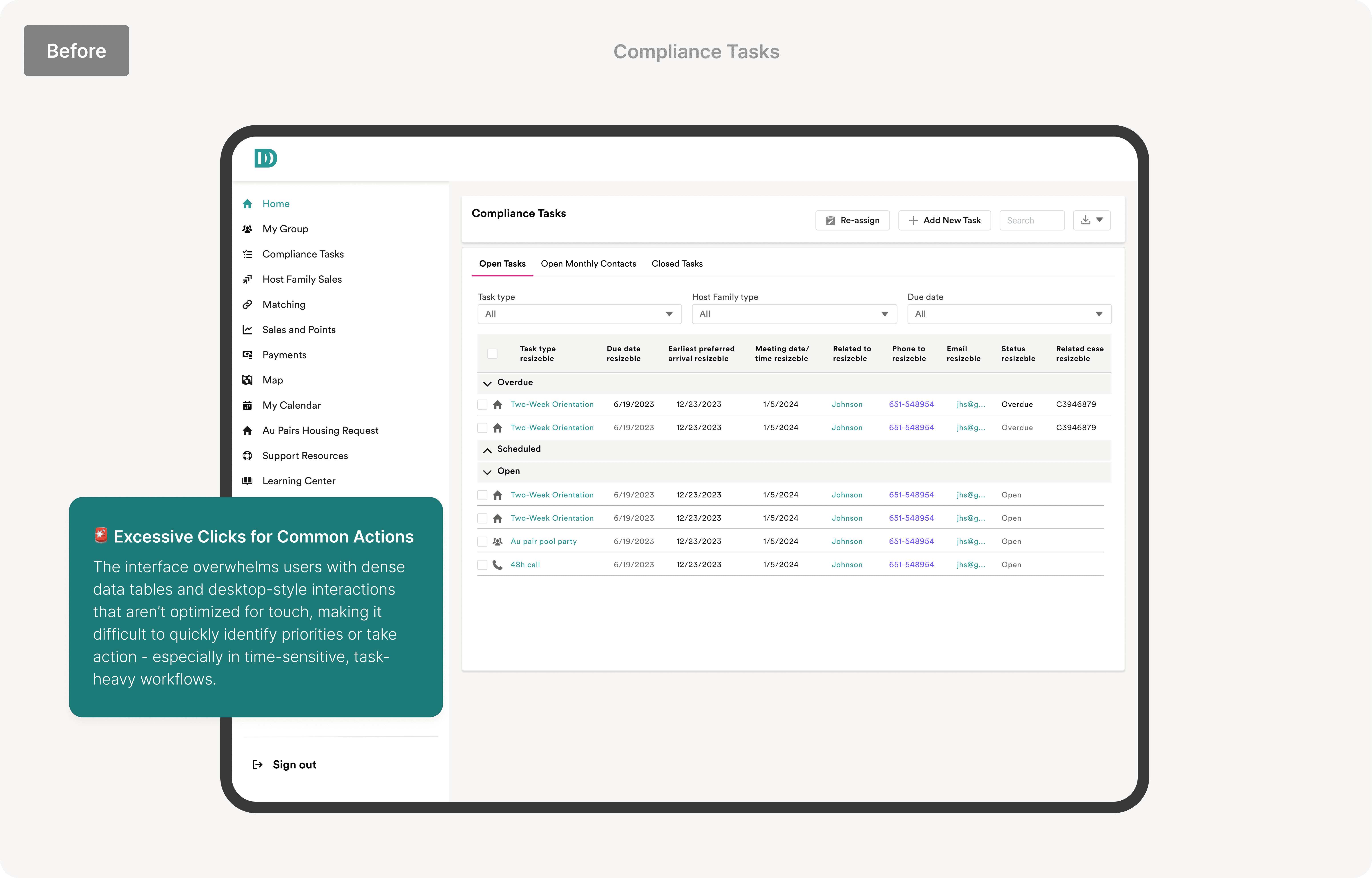 Research & Prototyping: Conducted stakeholder interviews and gathered feedback from 20 consultants to identify pain points, including hard-to-find tasks, excessive navigation, and a cluttered interface. Developed a high-fidelity prototype focused on surfacing key actions and reducing cognitive load, which was validated through moderated usability testing.