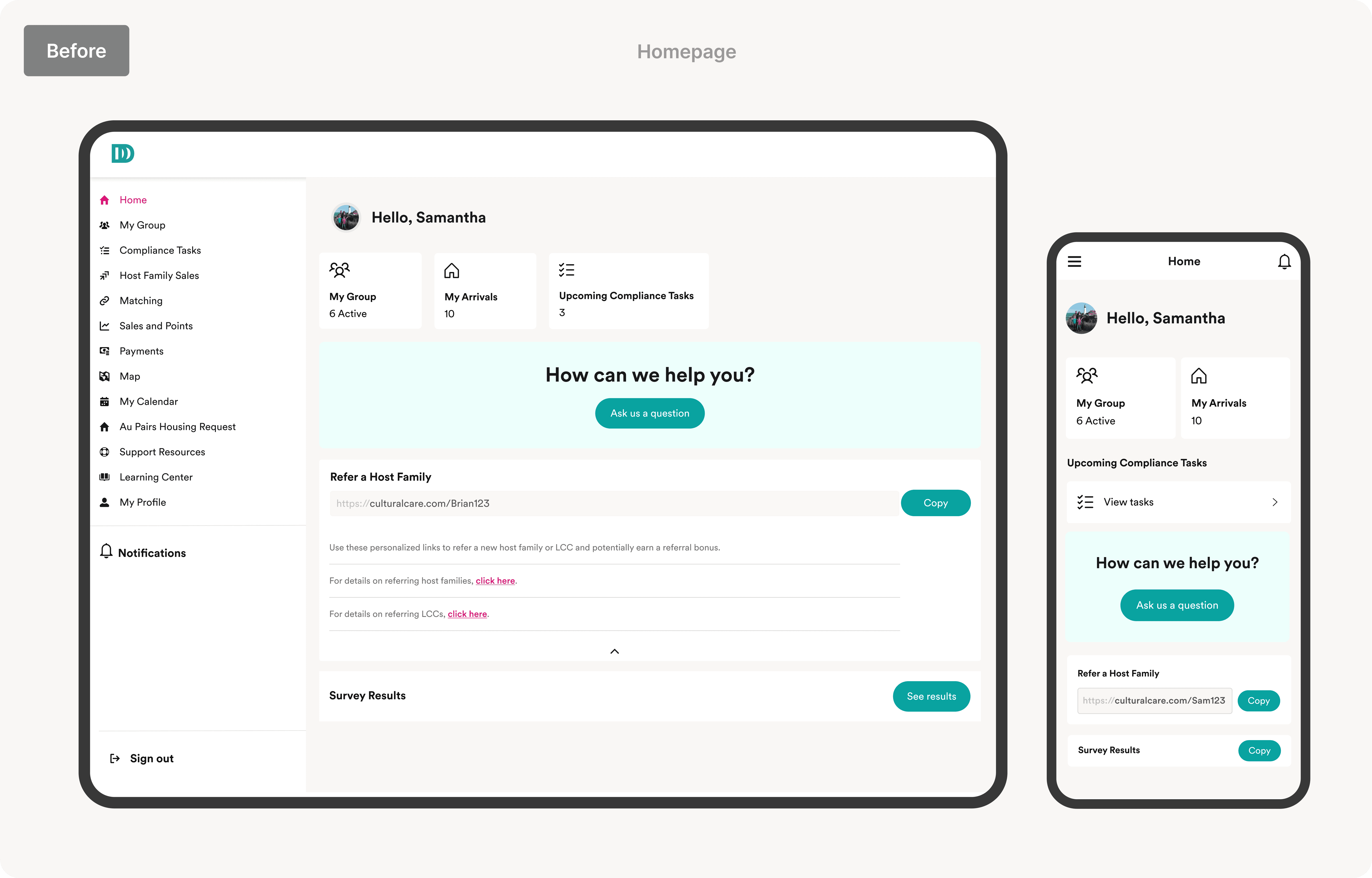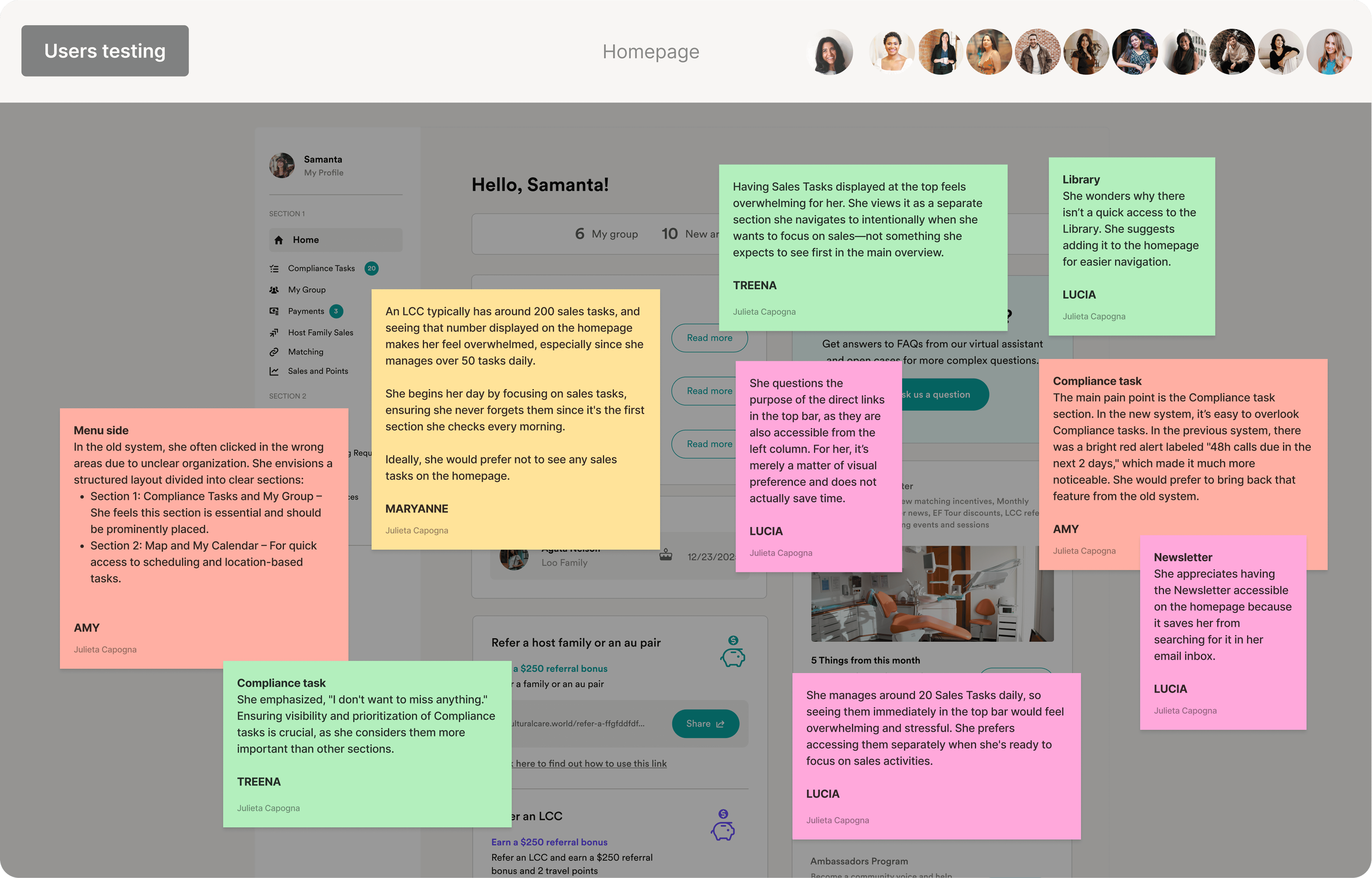 User Testing: User testing surfaced clear patterns around task priority, navigation friction, and layout expectations. It confirmed that consultants prioritize compliance tasks and need them visible upfront to avoid missed deadlines. Sales tasks were seen as distracting when shown too early, while tools like the Newsletter and Marketing Kit were valuable but too hidden. Users also preferred a homepage layout that reflected their real workflows - not just navigation logic - leading to design changes focused on clarity, hierarchy, and reduced friction.