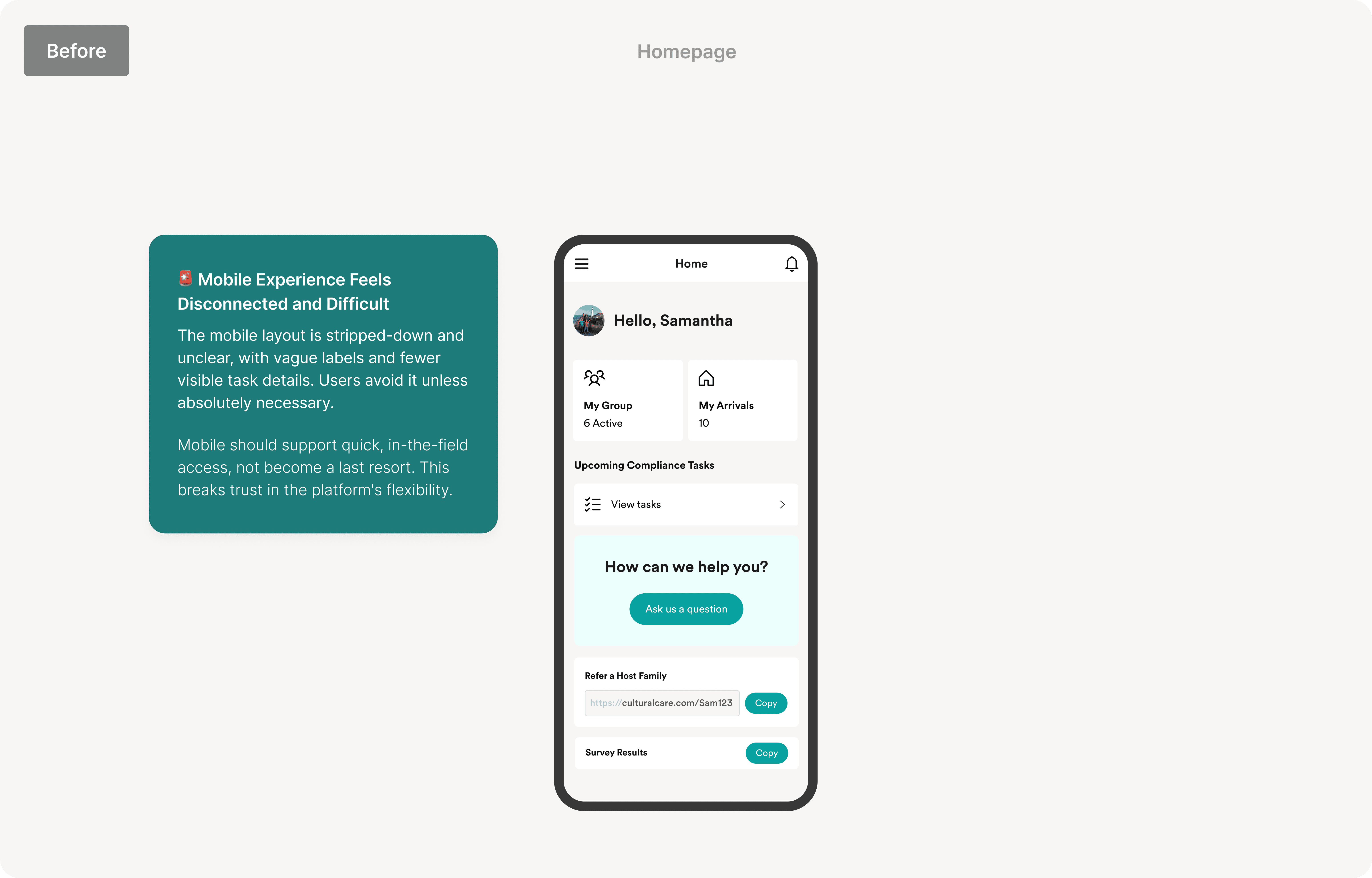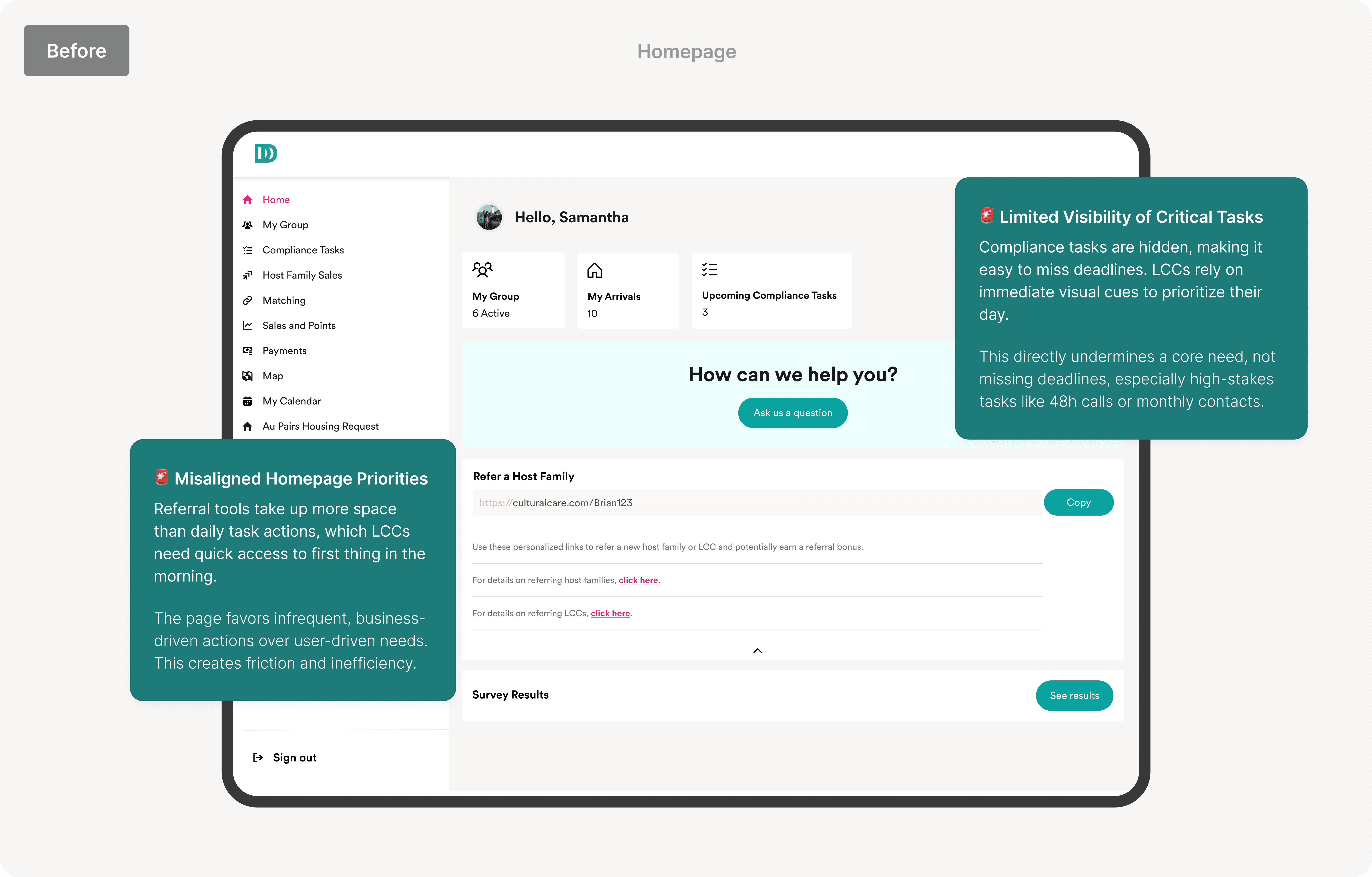 The existing compliance portal obscured critical actions, leading to inefficient workflows and diminished user trust. Key features were hidden, and the homepage lacked the immediacy needed to support daily operations, causing frustration and time loss among users.