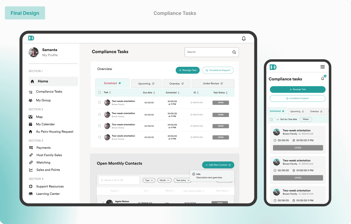 Redesigned a cross-platform compliance portal to enhance task prioritization and navigation. Focused on aligning the interface with real-world workflows, resulting in improved efficiency and user satisfaction.