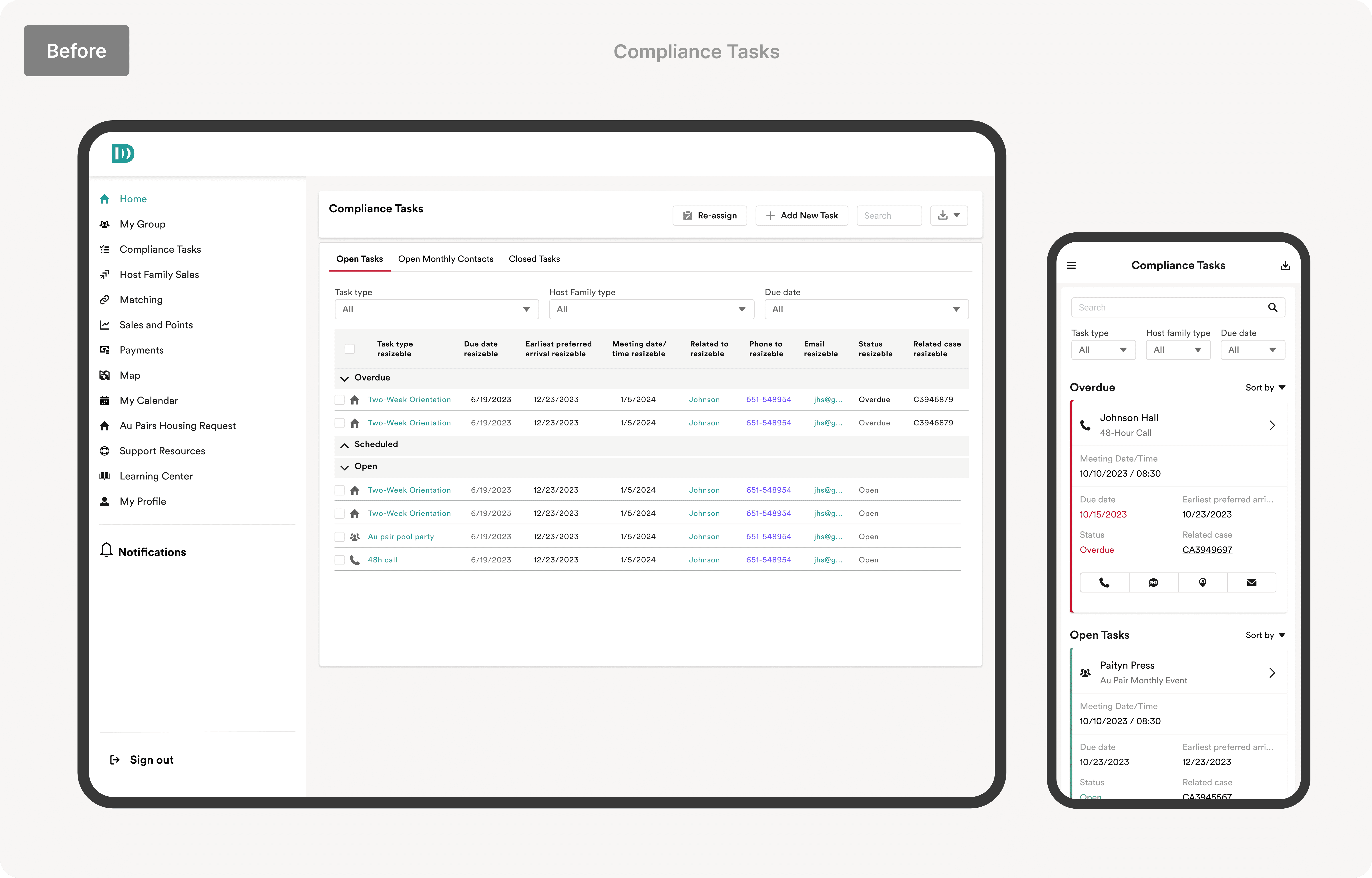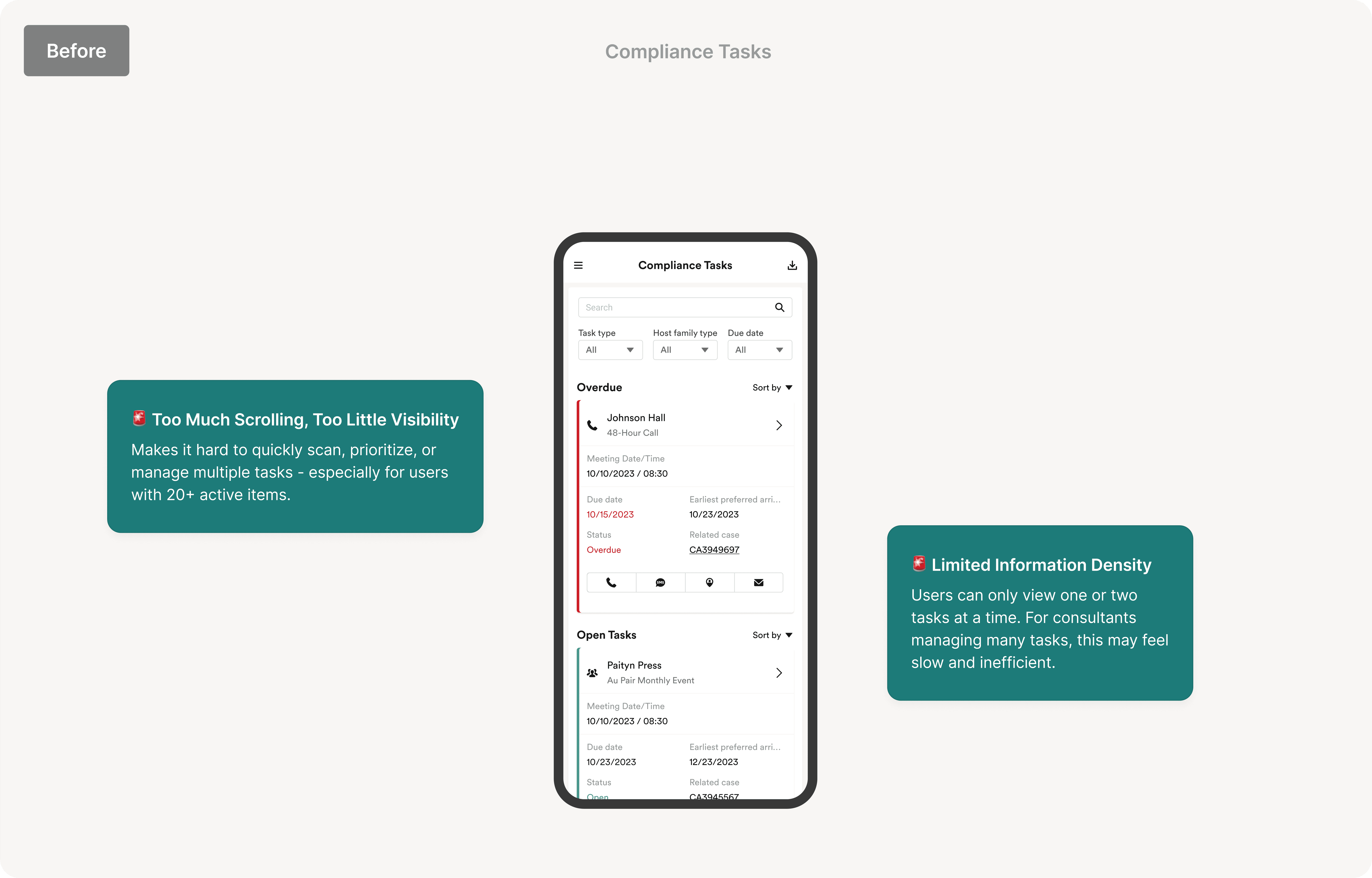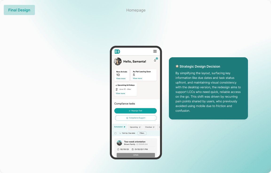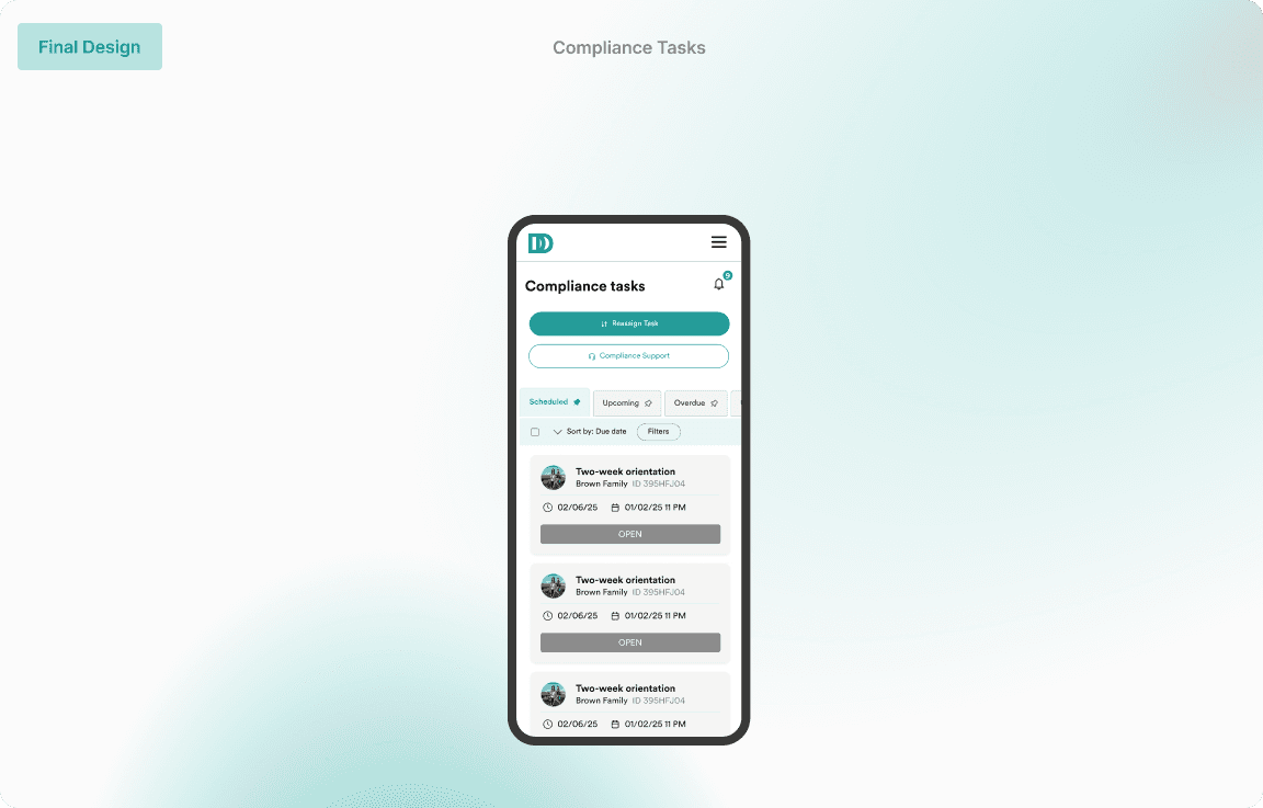 Solution: I redesigned for clarity, speed, and trust - across tablet and mobile. The final design brings back a simplified, familiar layout to improve clarity and task visibility. Key details like due dates and statuses are now surfaced upfront, reducing clicks and cognitive load. On mobile, Users were not engaging with the mobile app due to cognitive overload, visual noise, and lack of spatial orientation. Tasks and statuses were buried under overly dense information architecture, making it unclear where users were, what actions were expected, or which tasks were urgent.