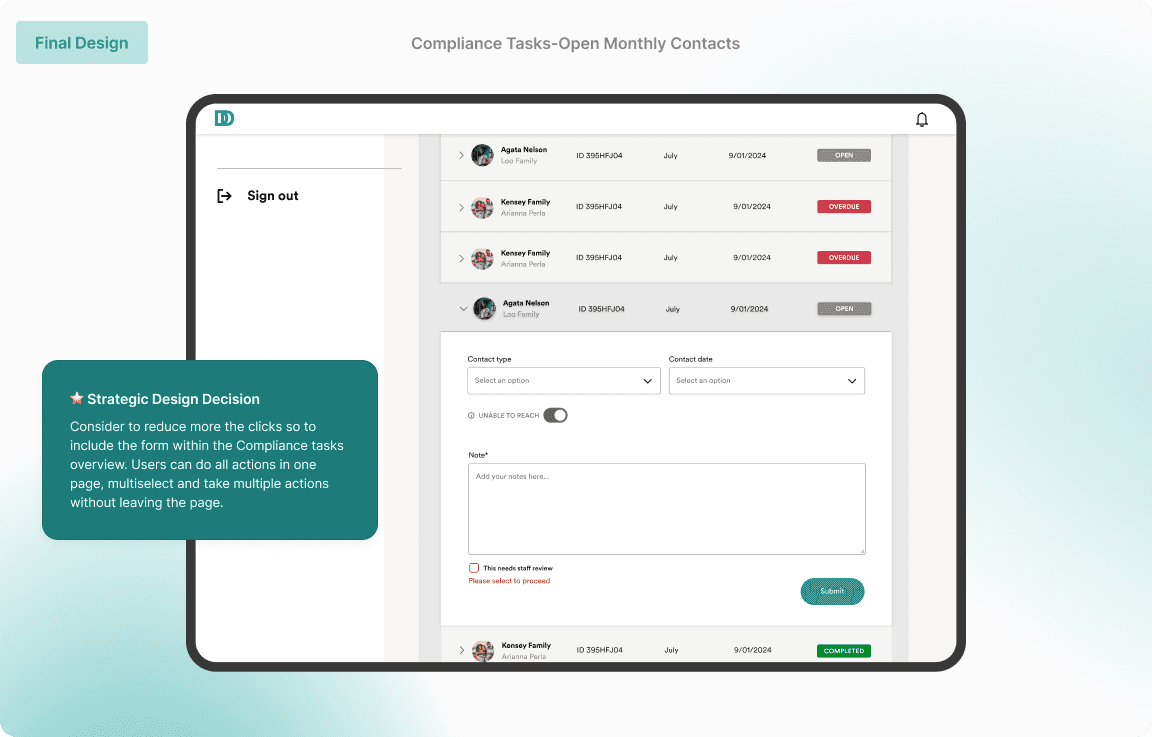 Solution: We redesigned for clarity, speed, and trust - across tablet and mobile. The final design brings back a simplified, familiar layout to improve clarity and task visibility. Key details like due dates and statuses are now surfaced upfront, reducing clicks and cognitive load. On mobile, Users were not engaging with the mobile app due to cognitive overload, visual noise, and lack of spatial orientation. Tasks and statuses were buried under overly dense information architecture, making it unclear where users were, what actions were expected, or which tasks were urgent.